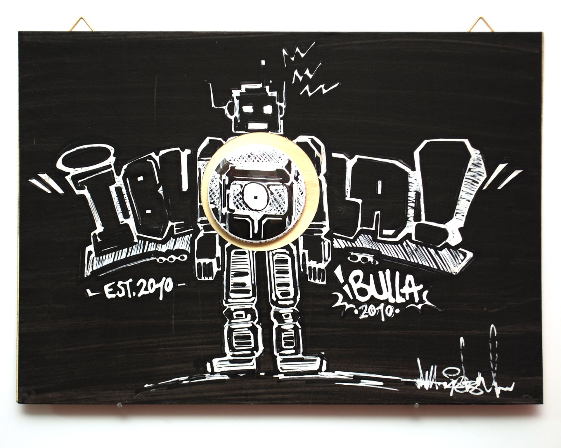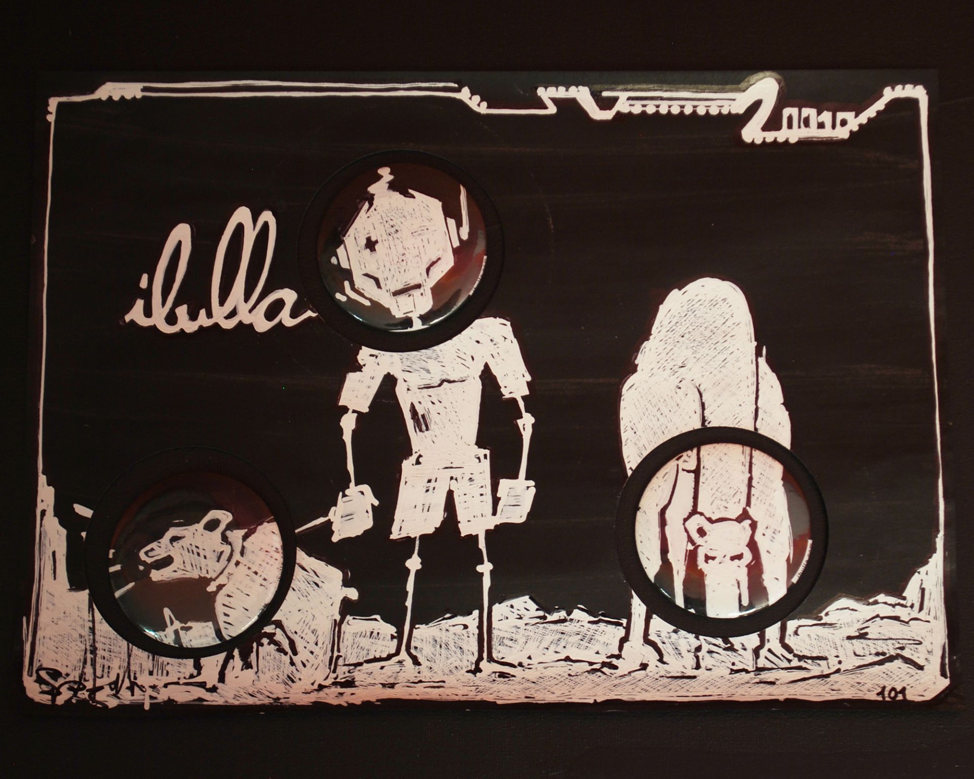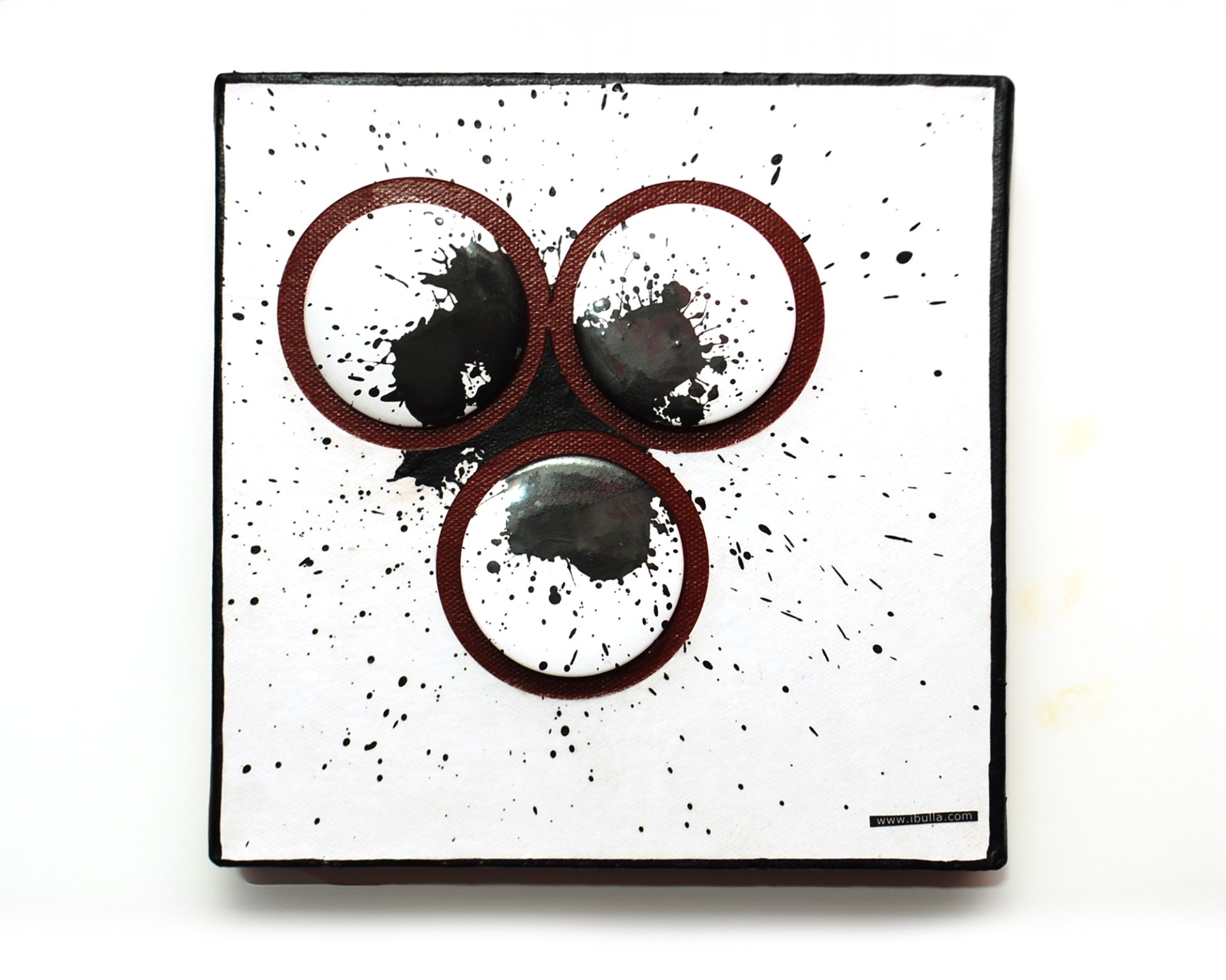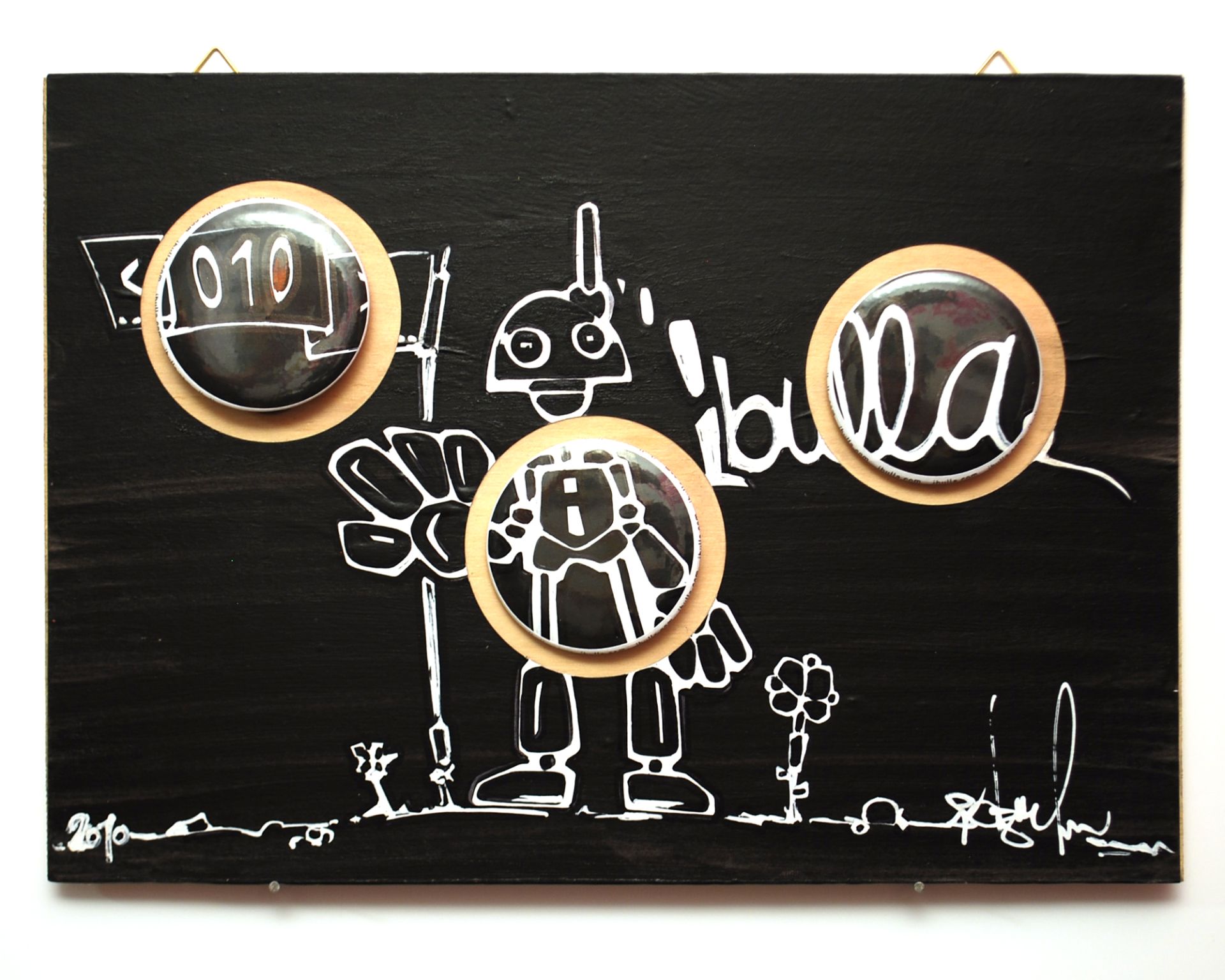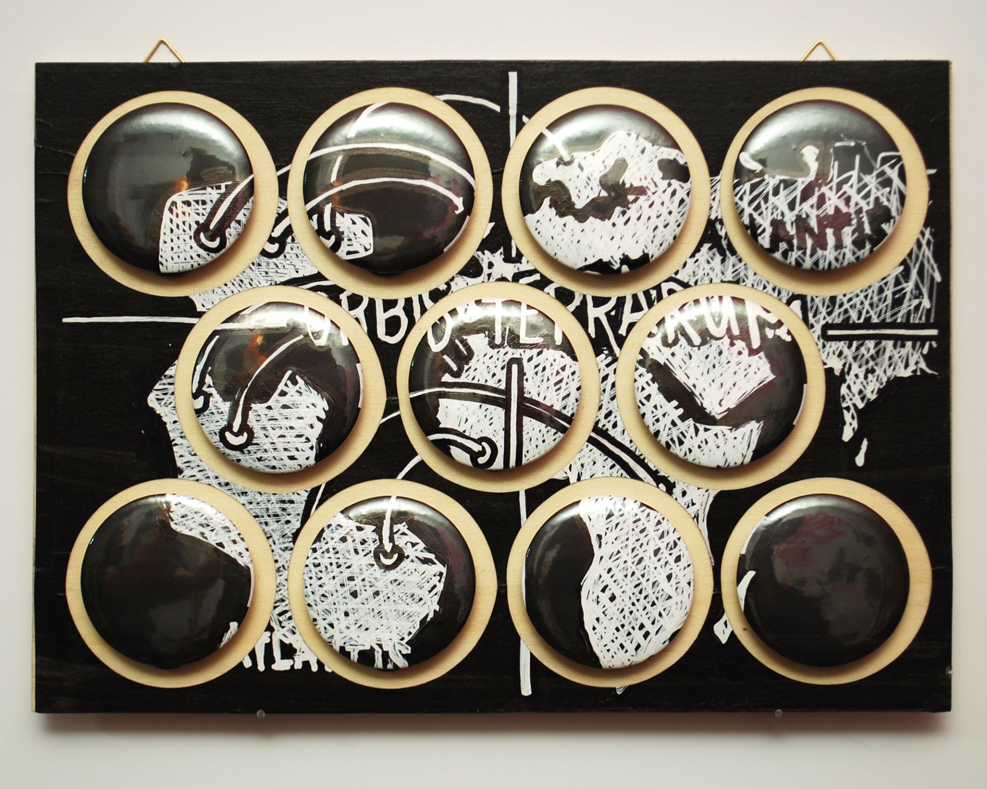 In this series, I explore the transformation of my drawings by cutting out circular segments, turning those pieces into wearable buttons, and then reinserting them into the original artwork. Each button is made from an actual fragment of the drawing—backed with a metallic front and sealed under plastic foil. I reflect on the cycle of creation, destruction, and renewal by physically removing a part of the composition and returning it in an altered form.