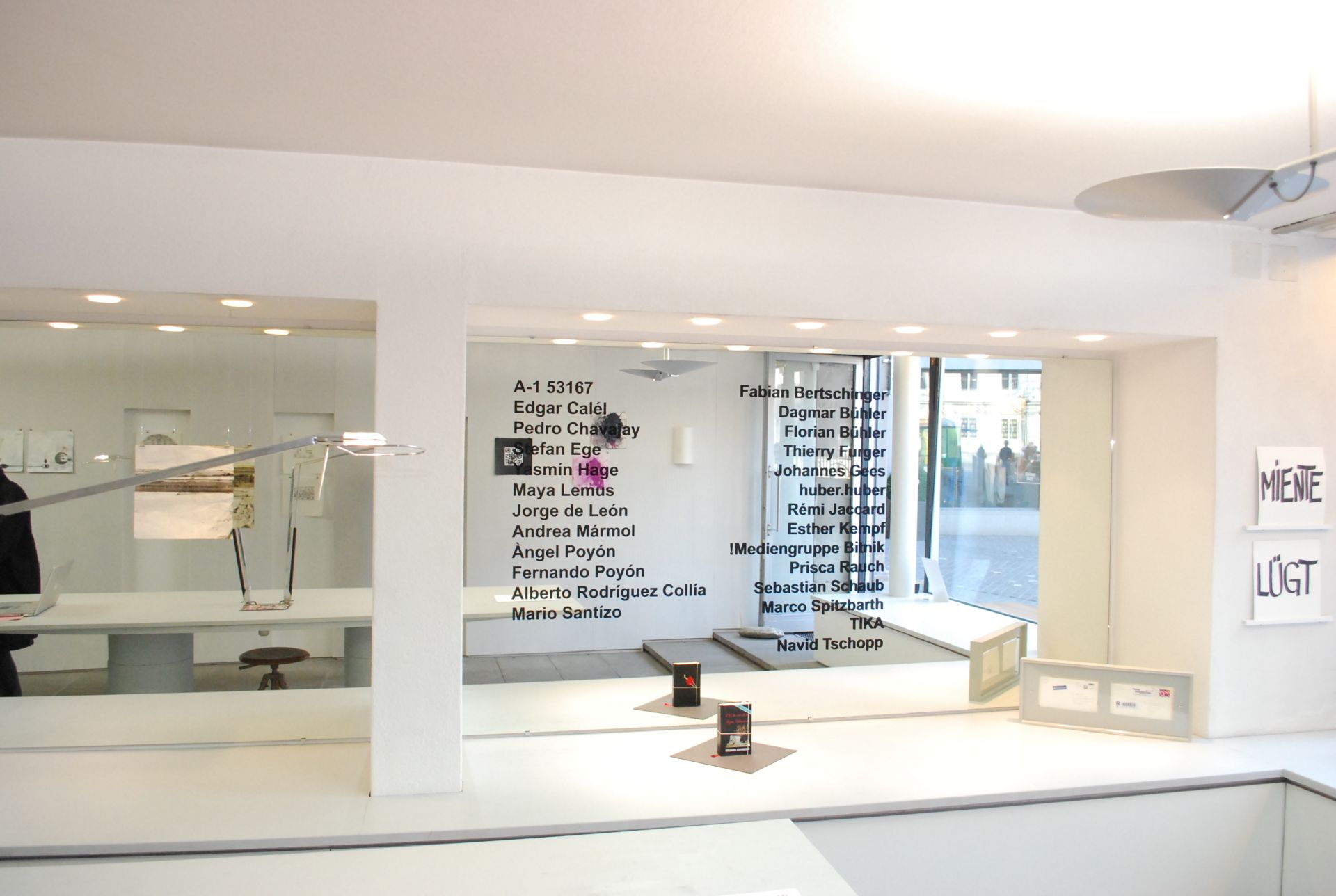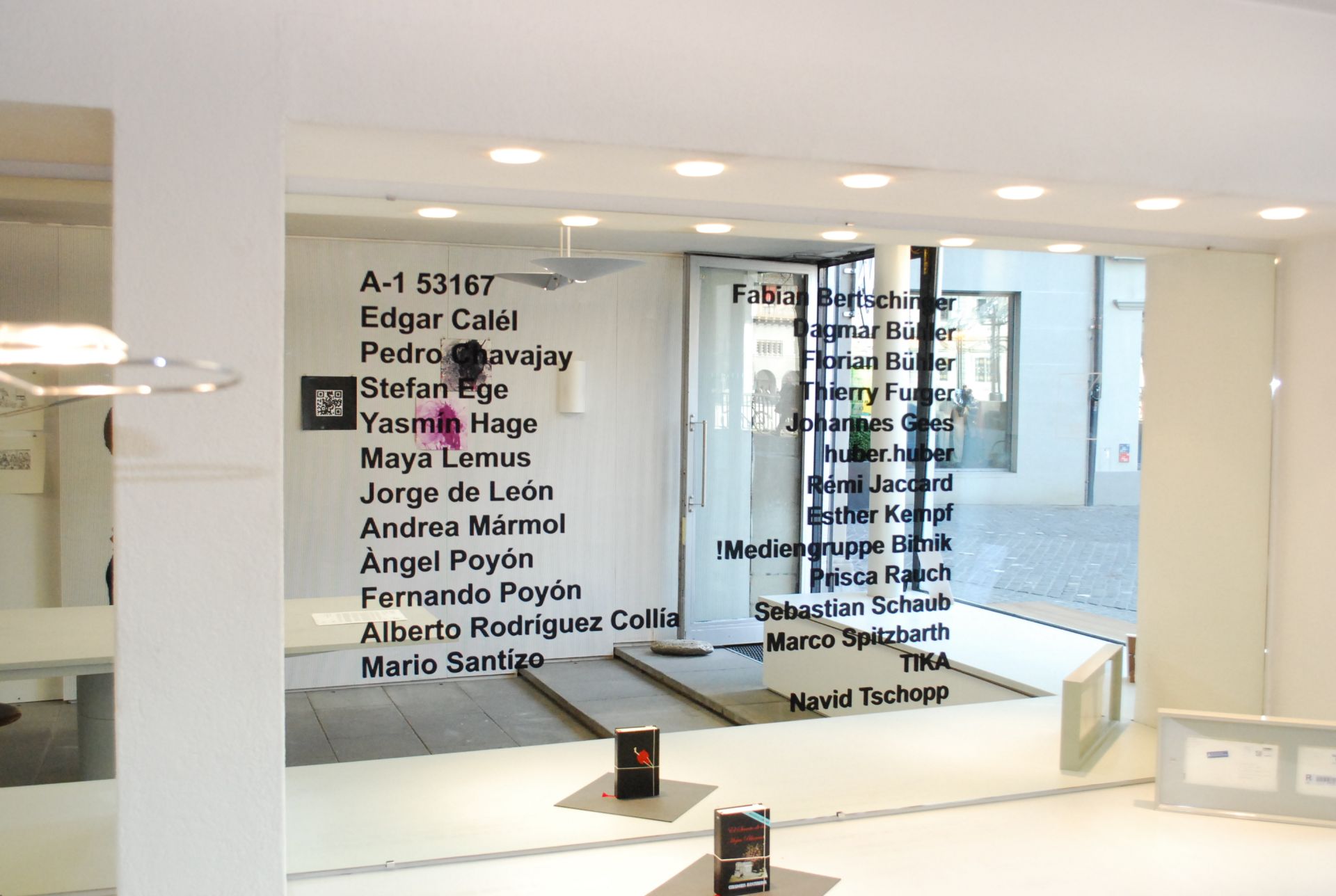 A-1 53167, Fabian Bertschinger, Dagmar Bühler, Florian Bühler, Edgar Calel, Pedro Chavajay, Stefan Ege, Thierry Furger, Johannes Gees, Yasmín Hage, huber.huber, Rémi Jaccard, Esther Kempf, Maya Lemus, Jorge de León, Andrea Marmol, !Mediengruppe Bitnik, Prisca Rauch, Alberto Rodriguez Collía, Mario Santizo, Sebastian Schaub, Marco Spitzbarth, Ángel Poyón, Fernando Poyón, TIKA, Navid Tschopp