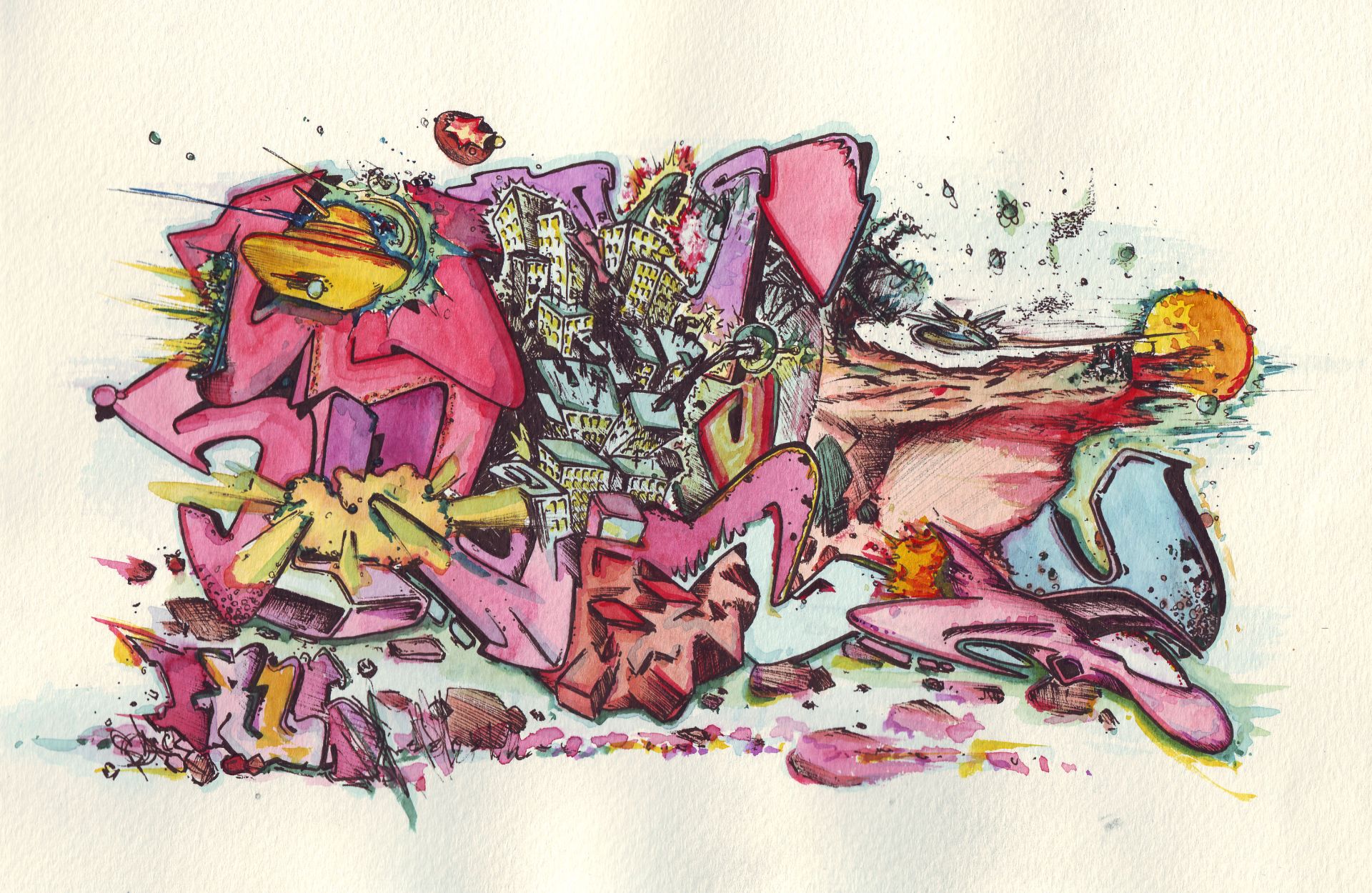 In the year 2000, I completed a vibrant aquarelle where fine, fluid lines converge into a buzzing urban landscape—a fusion of street art–inspired lettering, cityscapes viewed from above, and hints of rock formations and spaceship silhouettes. The piece pulses with movement, each shape interlocking and overlapping in what feels like a creative explosion. Through its saturated hues and free-form contours, the artwork captures a moment of dynamic energy, as though the possibilities of the streets, skies, and outer space have collided in a single, shifting panorama.