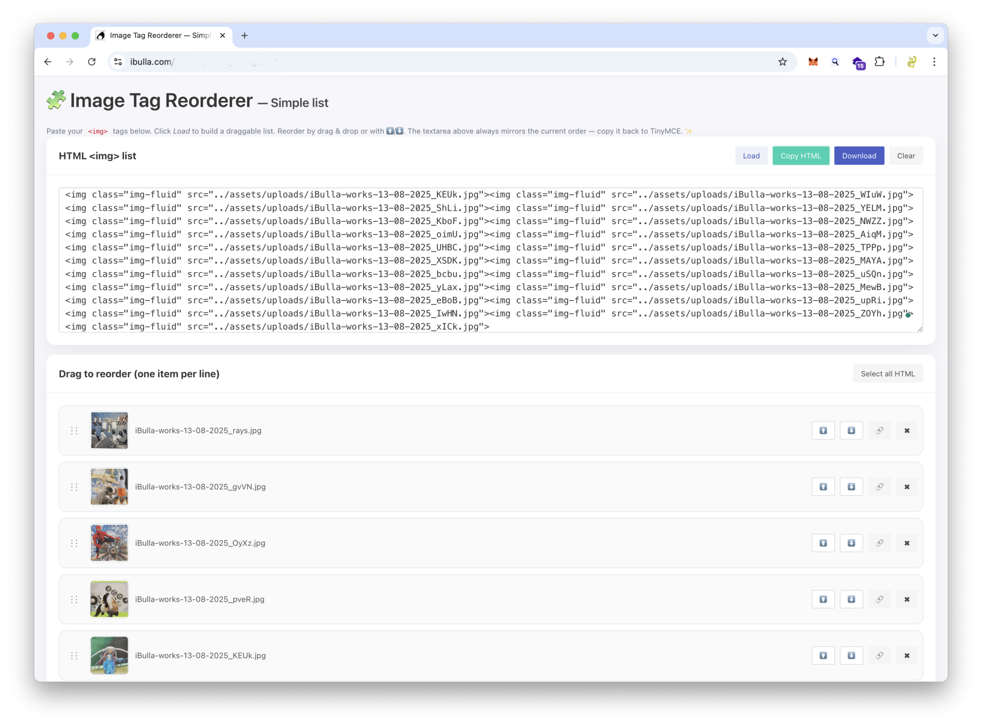 While writing, I stumbled upon the need for a simple but very specific tool: something that could take a raw list of HTML tags and let me easily reorder them—curating a new sequence without manual copy-paste chaos. Normally, this is the kind of task that would get lost on the “someday” pile. Coding a tool from scratch is time-consuming, and honestly, I might never have done it.